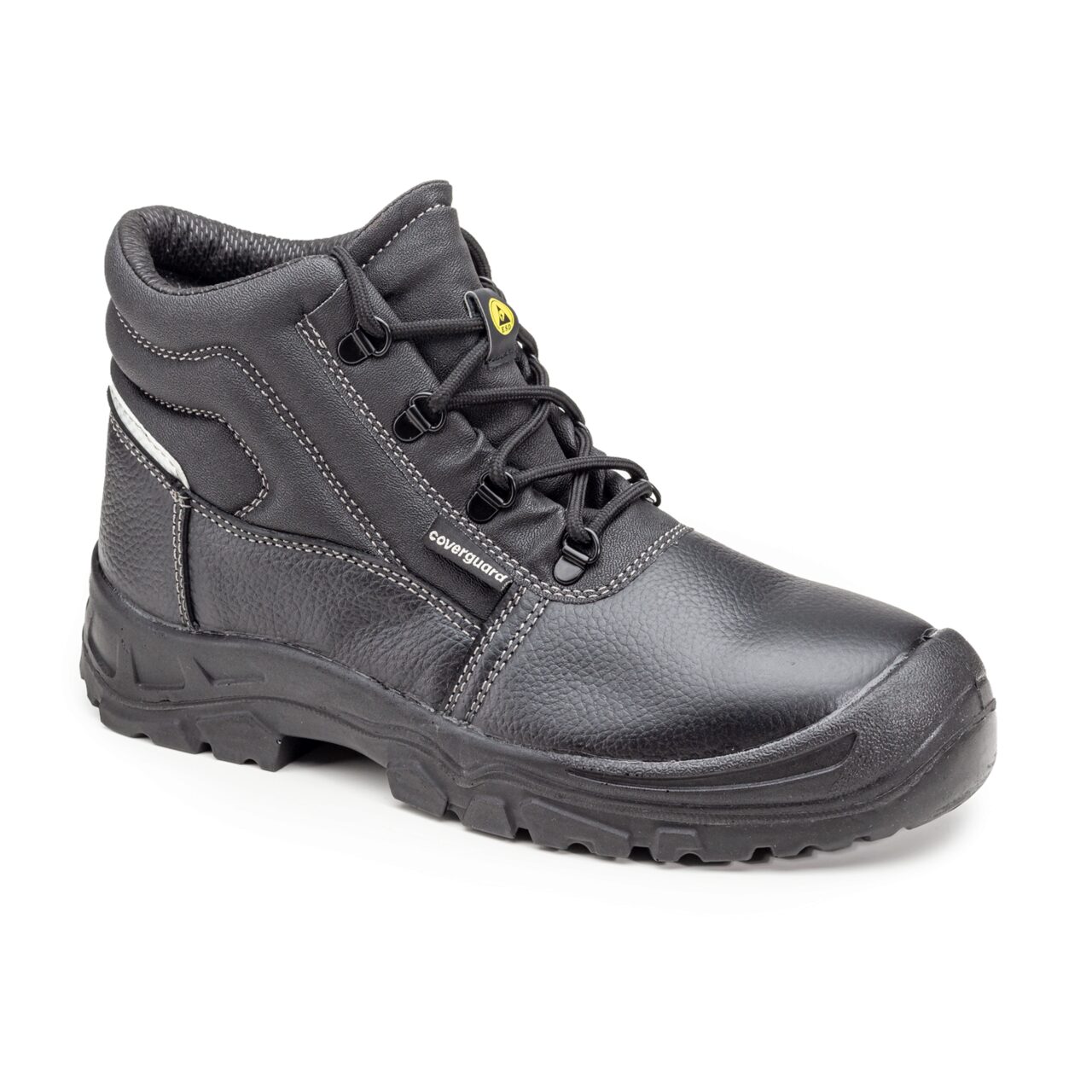 * încălțăminte de protecție neagră din piele, cu proprietăți ESD * talpă dublă din PU, antistatică, rezistentă la uleiuri, rezistență la alunecare SRC, testată pe suprafațe umede de ceramică și oțel * bombeu deprotecție din oțel împotriva obiectelor în cădere și lamelă de oțel anti-perforație, rezistență bună la apă și permeabilitate la vapori de apă * gleznă și limbă buretate, bandă decorativă reflectorizantă pe călcâie