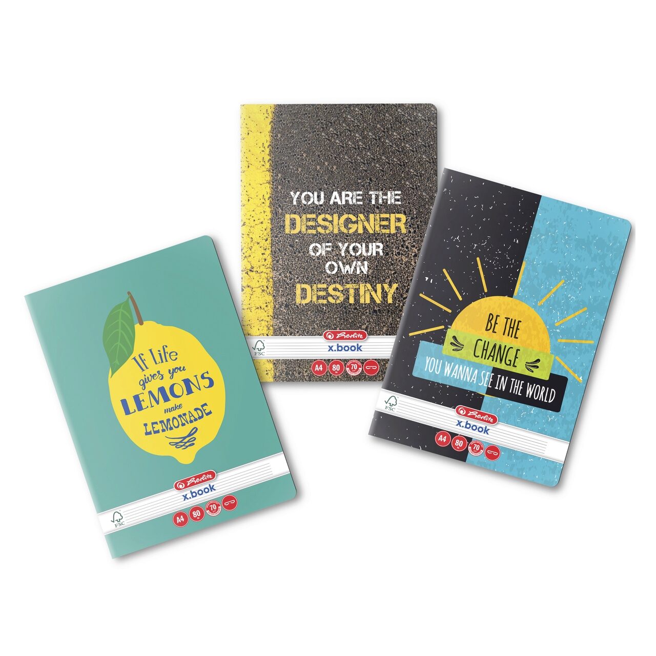 Caiet, format A4, coperti din carton dublu cretat, lucios, colturi rotunjite, hartie 70 g/mp, 80 file, dictando, capsat, motiv Quotes. Acest produs se comercializeaza la set de 5.