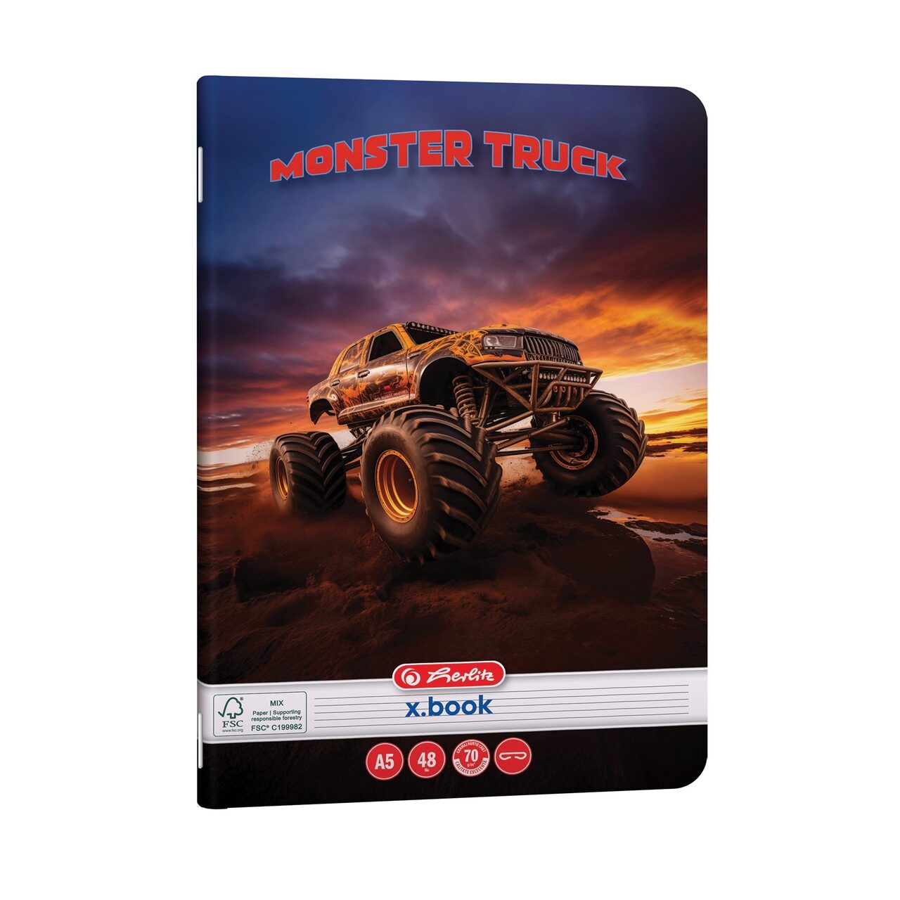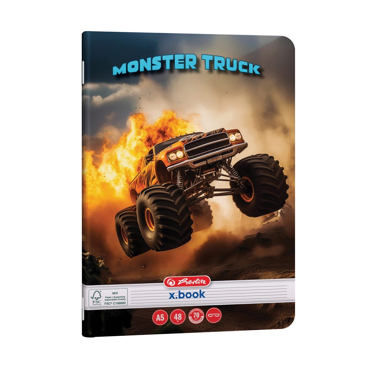 Caiet, format A5, coperti din carton dublu cretat lucios, colturi rotunjite, hartie 70 g/mp, 48 file, dictando, capsat, motiv Monster Truck. Acest produs se comercializeaza la set de 10