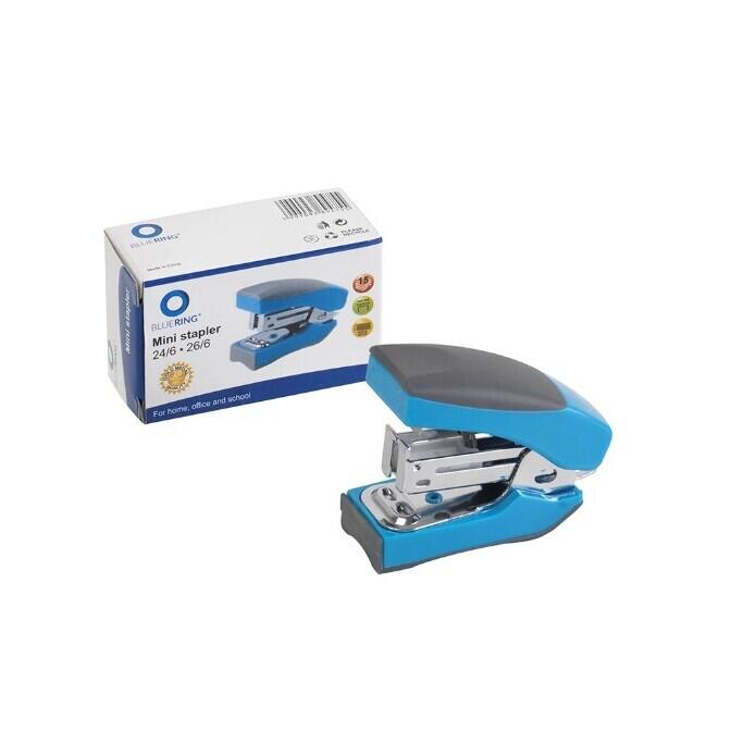 Capsator de dimensiuni mici, cu structură metalică, într-o nuanță de albastru deschis trendy. Cu elemente de protecție din plastic și o suprafață de apăsare ergonomică acoperită cu cauciuc. Prevăzut cu îndepărtător de capse încorporat. Potrivit pentru capsele de tip 24/6 și 26/6. Capacitate de așezare a hârtiei: 15 coli. Adâncime de așezare: 27 mm.