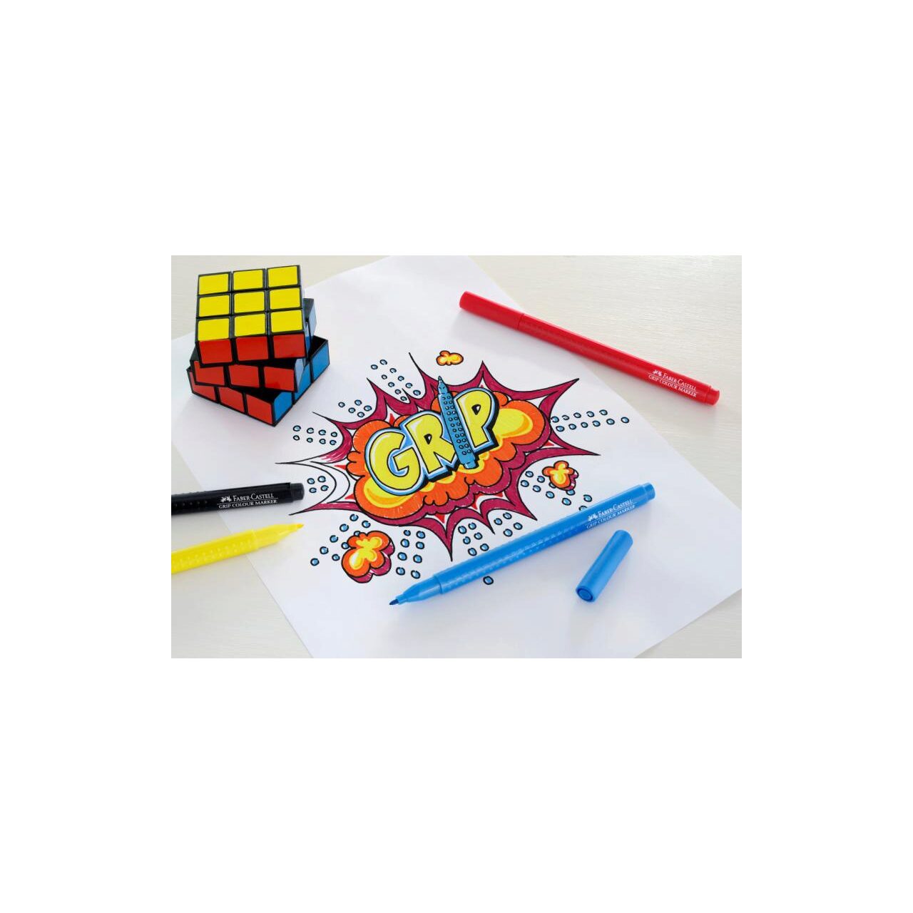 Forma ergonomica triunghiulara, pentru o folosire usoara. Zona anti-alunecare patentata GRIP, cu mici puncte de masaj. Varf rezistent la presiune crescuta. Cerneala pe baza de apa si substante naturale. Culorile pot fi curatate de pe majoritatea tesaturilor. Culori luminoase si expresive.