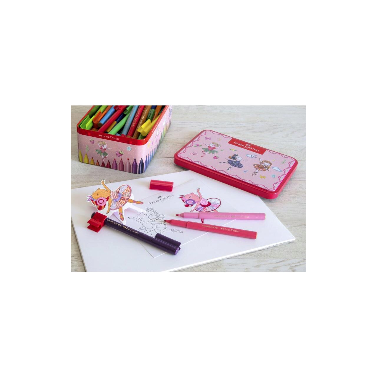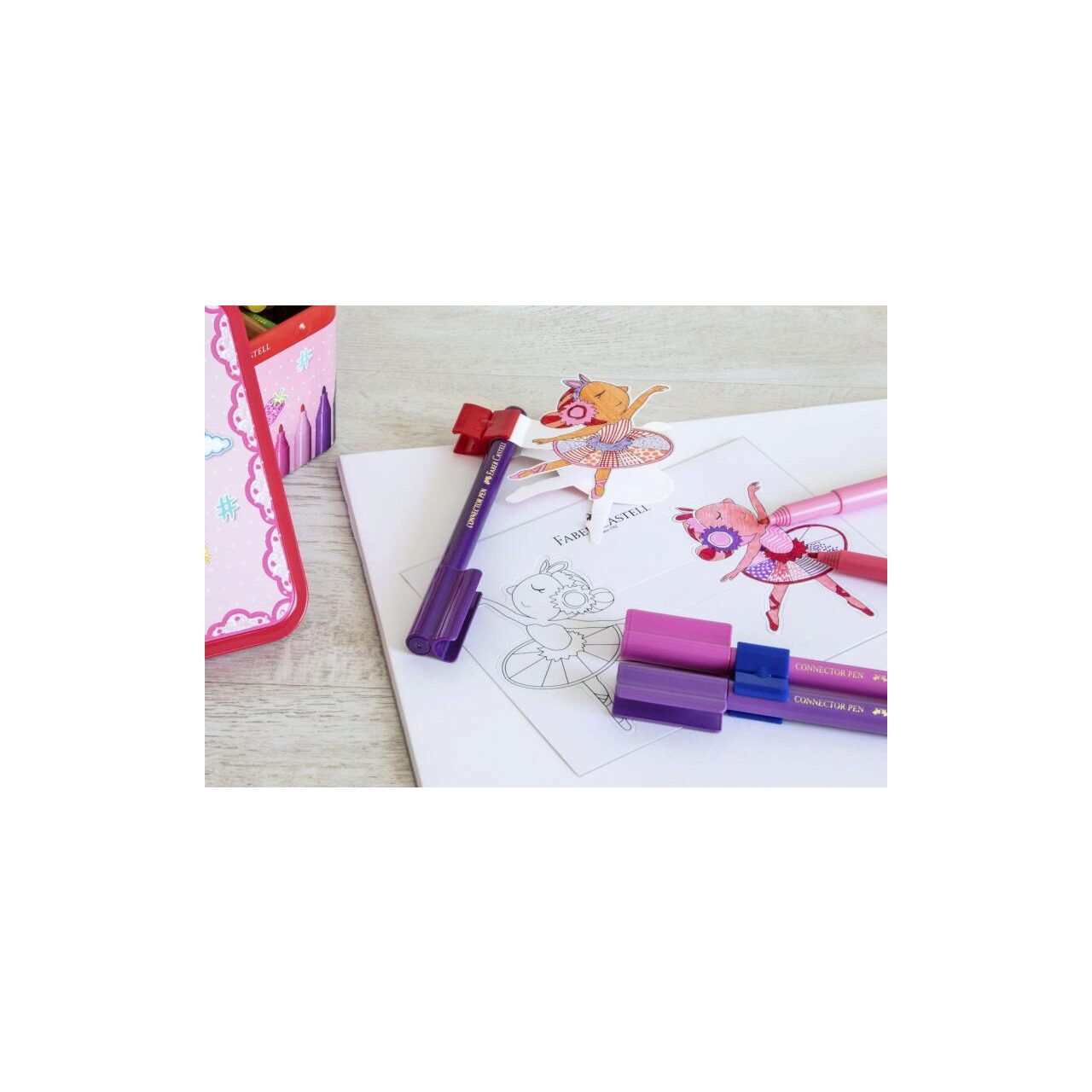 Cutie metalica cu design atractiv balerina. Contine template de colorat si 33 de carioci Connector care se pot conecta intre ele datorita clipului inovativ. Cerneala pe baza de apa. Culori intense, luminoase. Se pot curata de pe majoritatea materialelor textile.