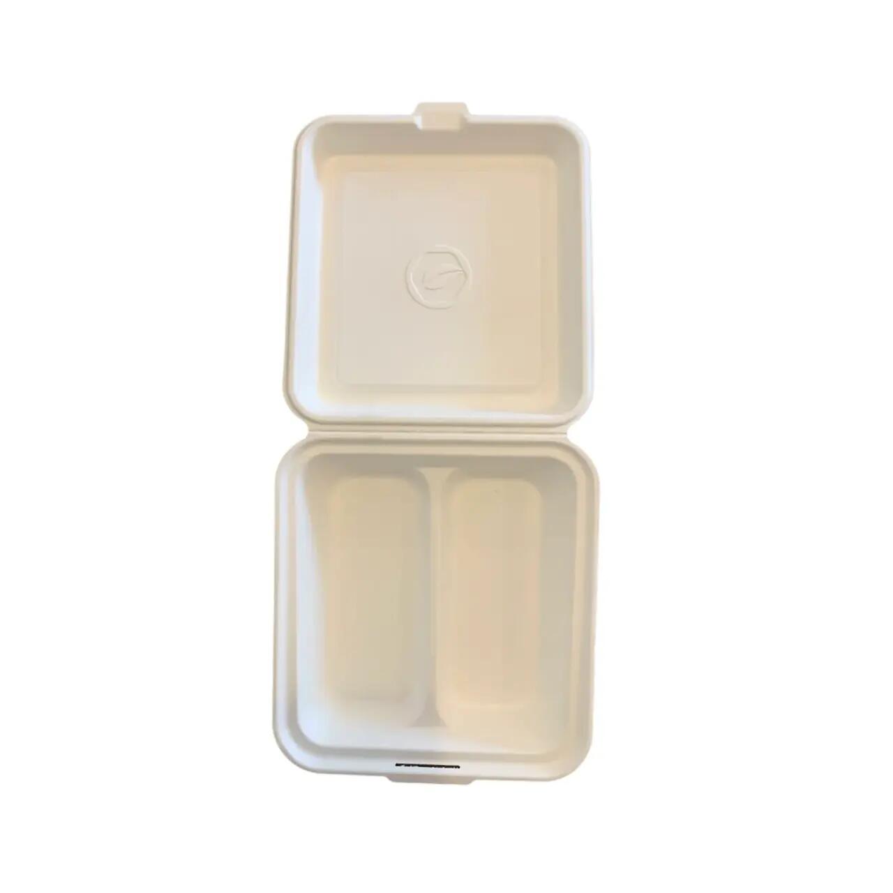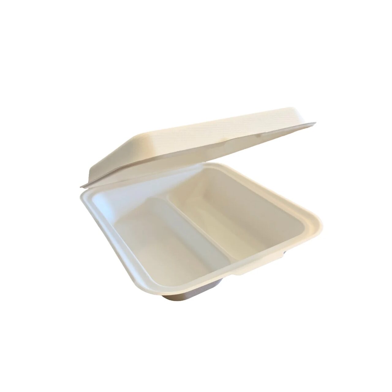 Cutie de luat la pachet din trestie de zahăr împărțită în 2 părți.