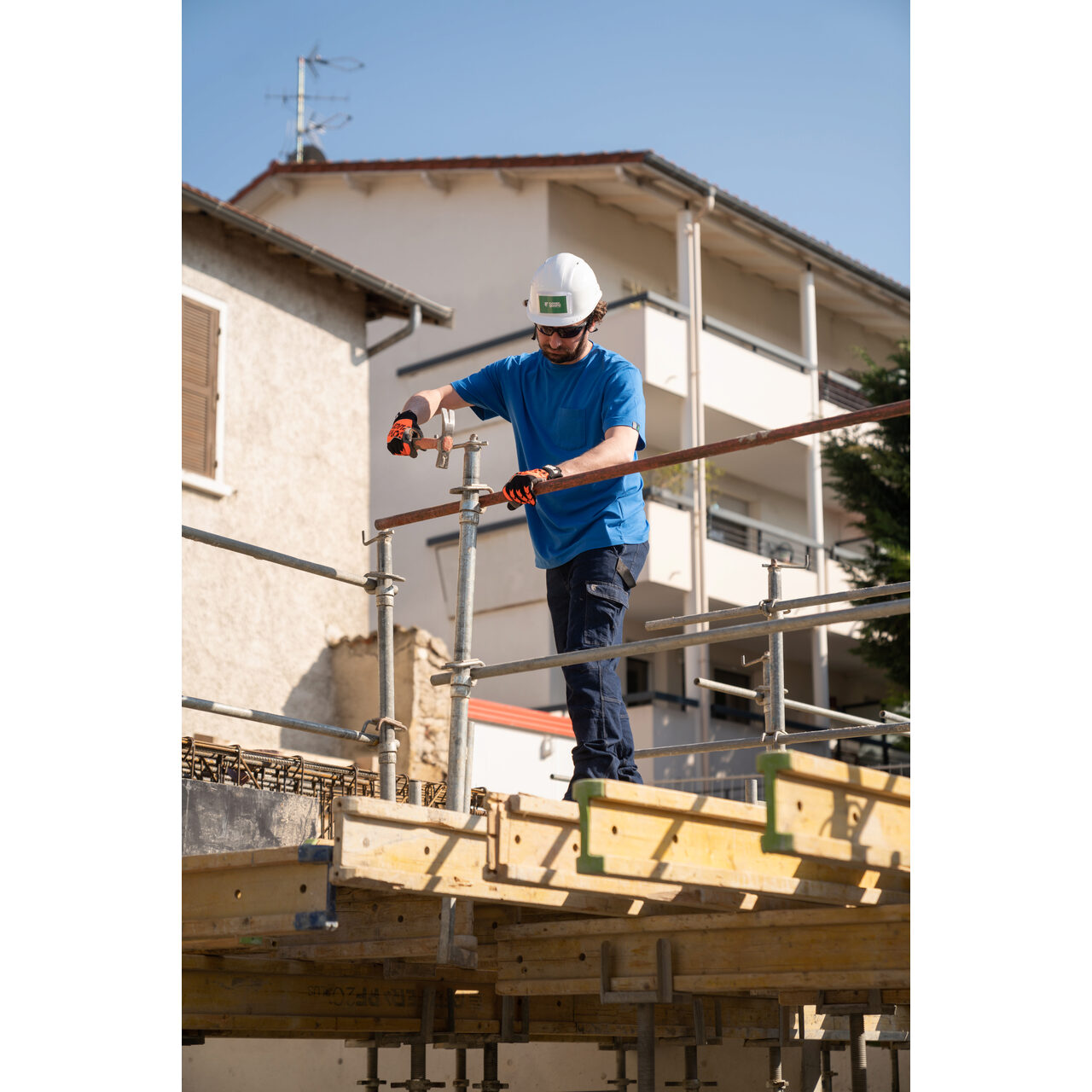 TWILL: 98% Bumbac / 2% Elastan - 310g/m2 Spate înalt 6 buzunare 1 buclă pentru scule Bandă elastică în talie pe laterale Buzunare pentru genunchiere Cusături triple Croială regular EN 14404: Tip 2