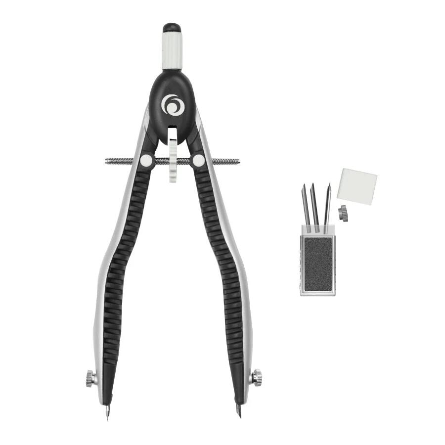 Set compas, model my.pen, material plastic, cu rezerve pentru mina, posibilitate de a ascuti mina, varf metalic de rezerva, culoare negru/gri, in cutie suspendabila.