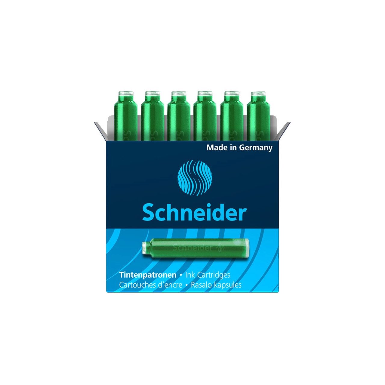 Cutie cu 6 rezerve de cerneală Schneider sigilate cu bilă. Patroanele Schneider se potrivesc stilourilor și rollerelor care folosesc acest sistem de încărcare.