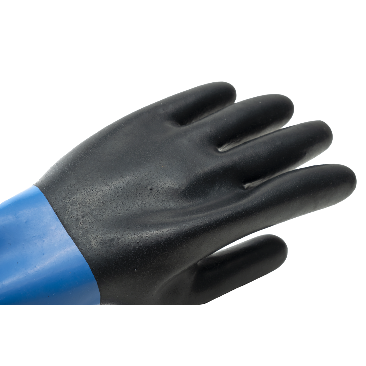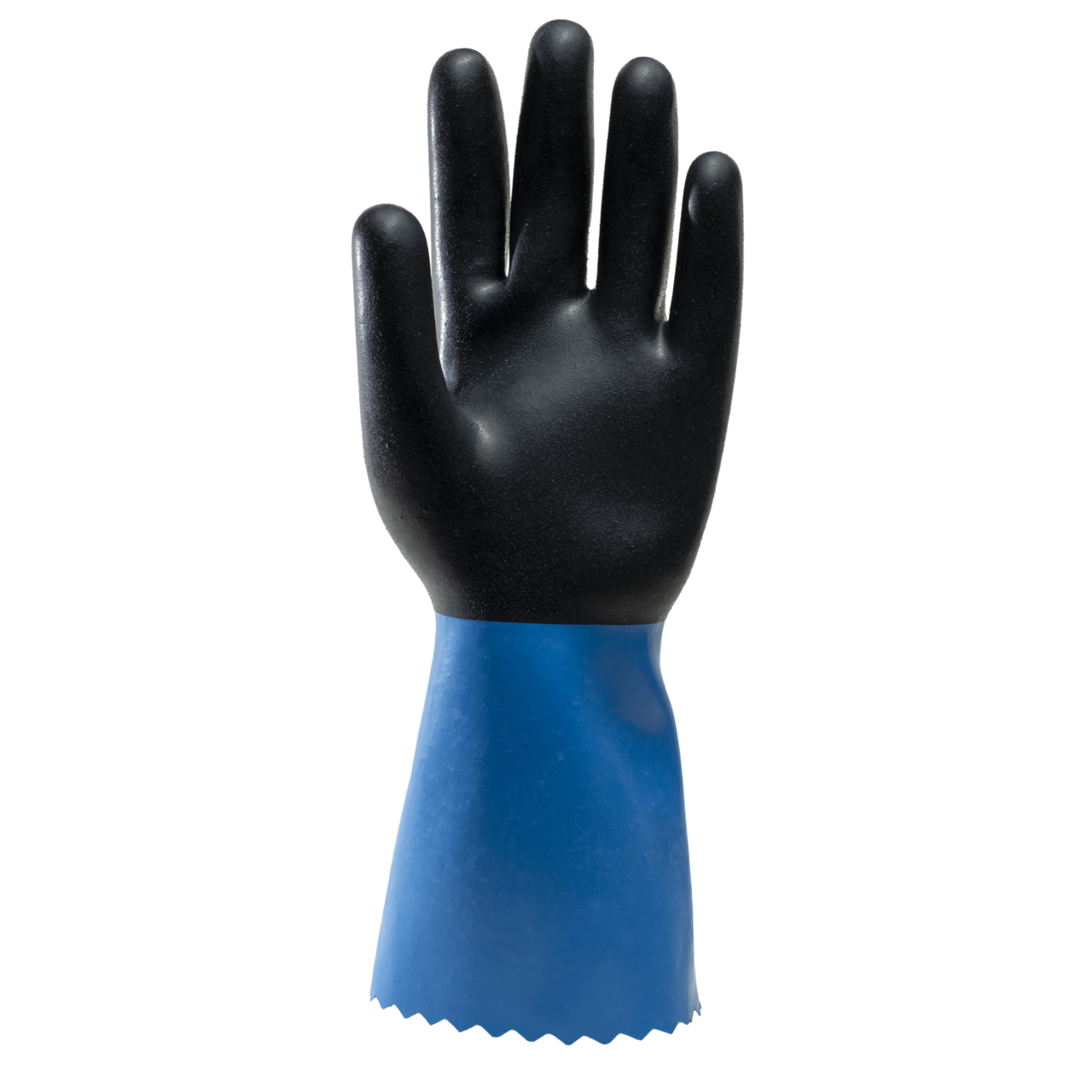 Mănuși EUROCHEM NE530, acoperite complet cu neopren albastru și negru, Pe suport din poliester-bumbac, Finisaj dur pe palmă, manșetă sinusoidala pentru rezistenta la rupere, Grosimea aprox. 0,9 mm, Lungime totala 350 mm