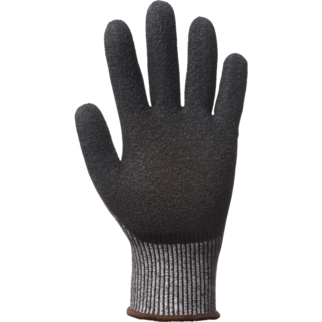 mănuși de protecție din HPPE (high performance PE) + fibre de sticlă, tricot de 13, cu rezistență maximă la rupere și uzură, rezistență la perforare, rezistență la tăiere de nivelul maxim 5 * mănuși de protecție imersate în latex crep negru în zona palmei, cu durată crescută de viață * ușoare, extra-confortabile, se mulează perfect pe mână, cu proprietăți antiderapante extra atât în medii umede, cât și în medii umede * manșetă elastică cauciucată * gamă largă de mărimi