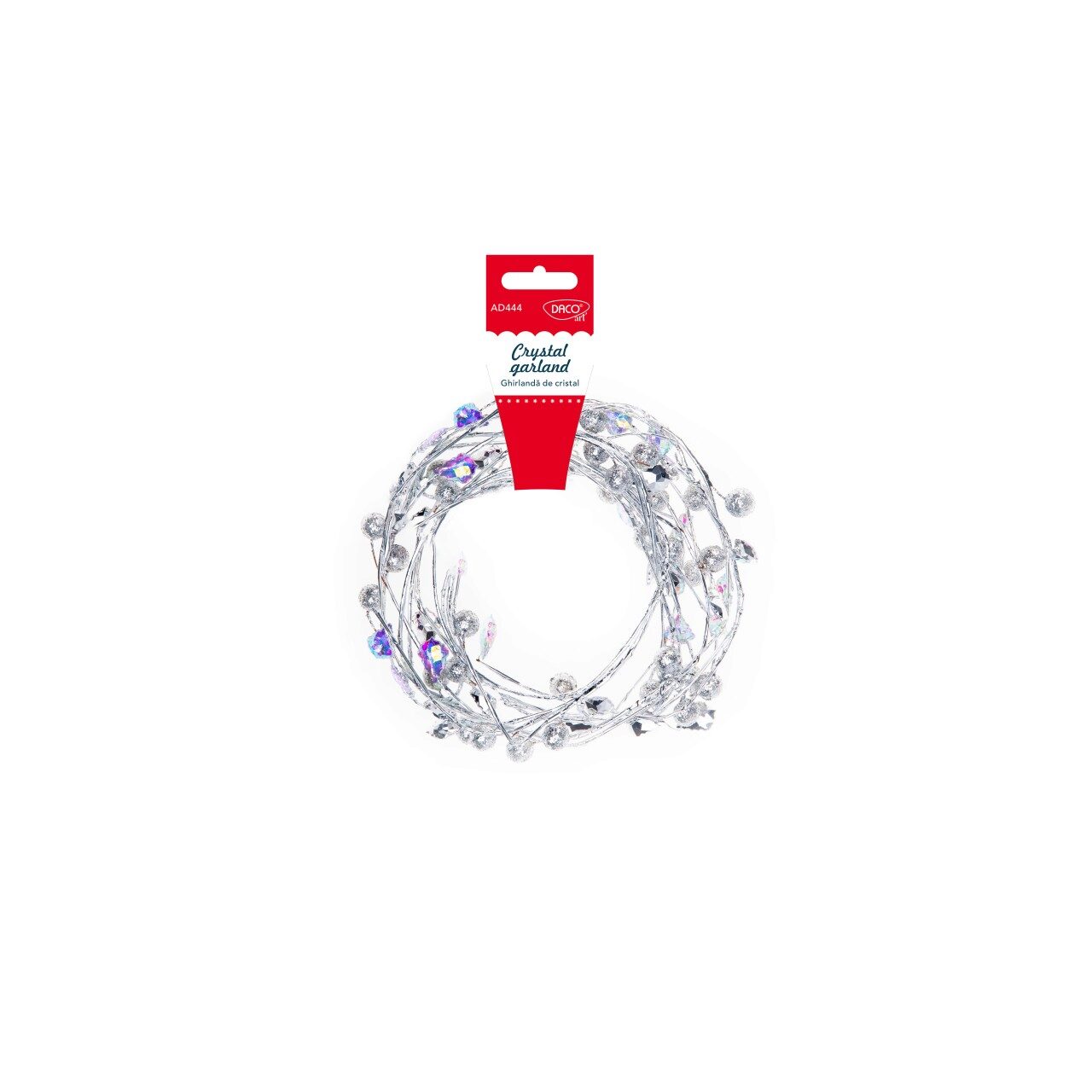"Ghirlanda de cristal" DACOart este un accesoriu craft minunat pentru a-ți aduce strălucire și eleganță proiectelor tale. Aceasta ghirlandă frumoasă, cu o lungime de 1.5 metri, este confecționată din plastic și sârmă rezistentă, fiind disponibilă într-o nuanță sclipitoare de argintiu.