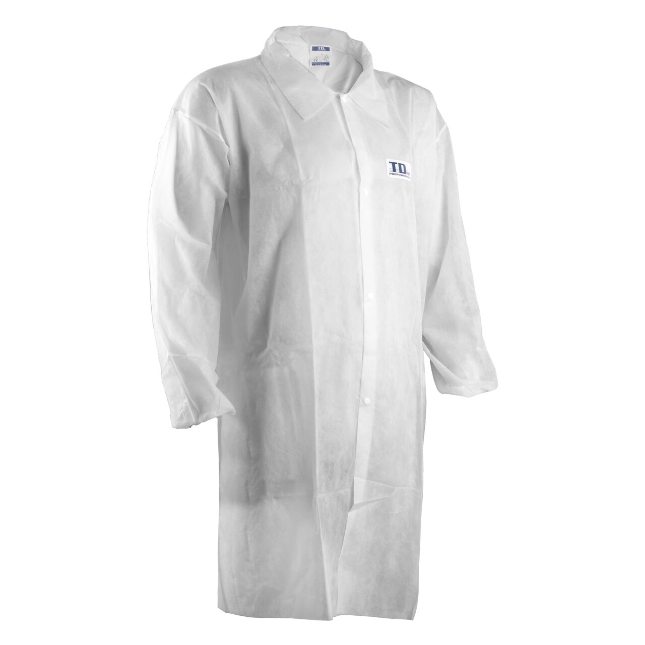 Geacă albă din polipropilenă SPP * închidere cu 4 capse, cu manșetă elastică și guler clasic * 42 g / m2 grosime, fără buzunare * 110 cm lungime