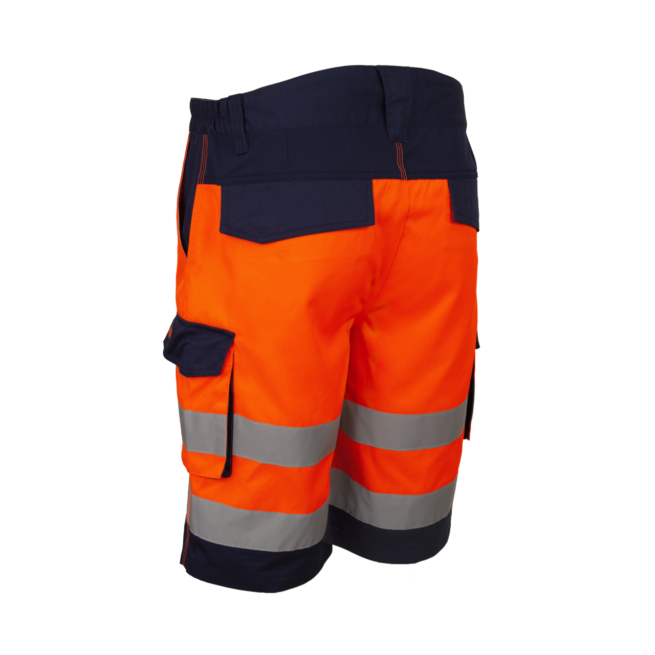 Hibana bermude hi-vis de culoare orange HV/Navy Țesătură: 60% bumbac / 40% poliester - grosime 270 g/m2 Inserții Elastice: 90% poliamidă / 10% elastan - grosime 270 g/m2 Talie elastică Spate ridicat cu inserție elastică stretch 6 buzunare Inserție elastică Cusături triple de siguranță