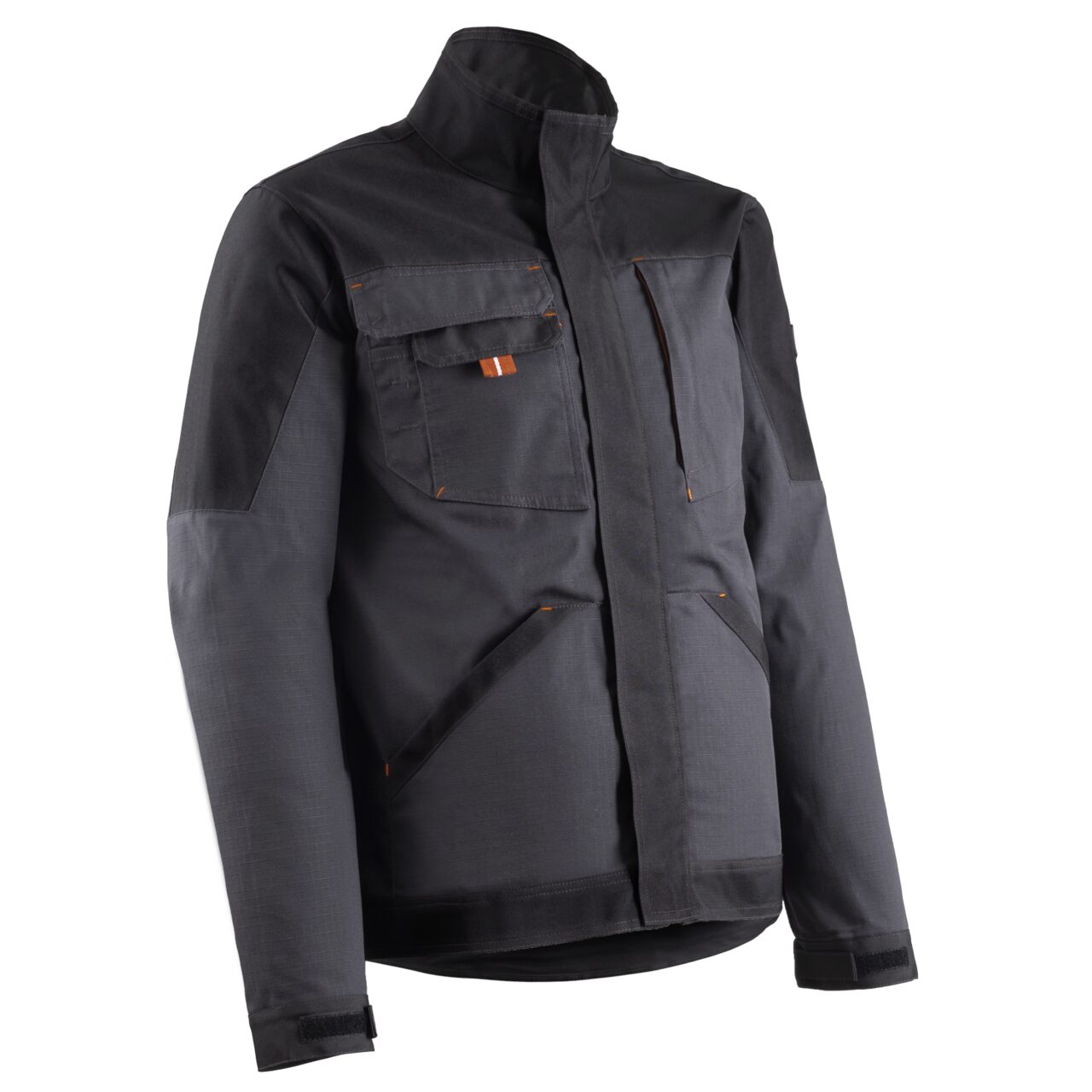 RIPSTOP: 60%Bumbac / 40%PES 280g/m² + poliamidă / inserții elastice + OXFORD 600D - Gri închis / Portocaliu Spate extins 5 buzunare Guler înalt Fermoar central (YKK) + clapetă frontală Manșete reglabile prin velcro Zona de întindere pe umerii în spate Inserții reflectorizante