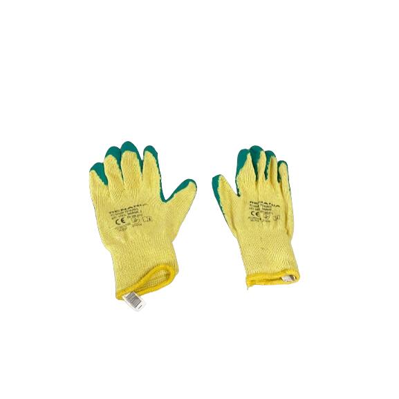 Manusi de protectie din tricot galben din poliester, acoperite cu latex verde.