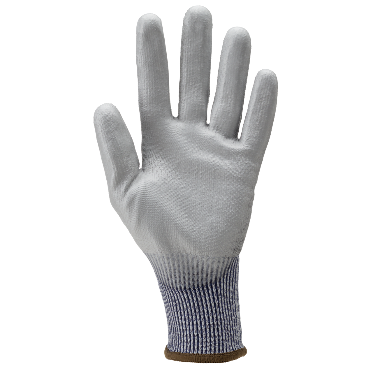 Mănuși gri fără cusături, din HDPE, poliamidă, elastan, tricot calibrul 18, Acoperire în palmă din poliuretan gri, Touch screen, Încheietură tricotată.