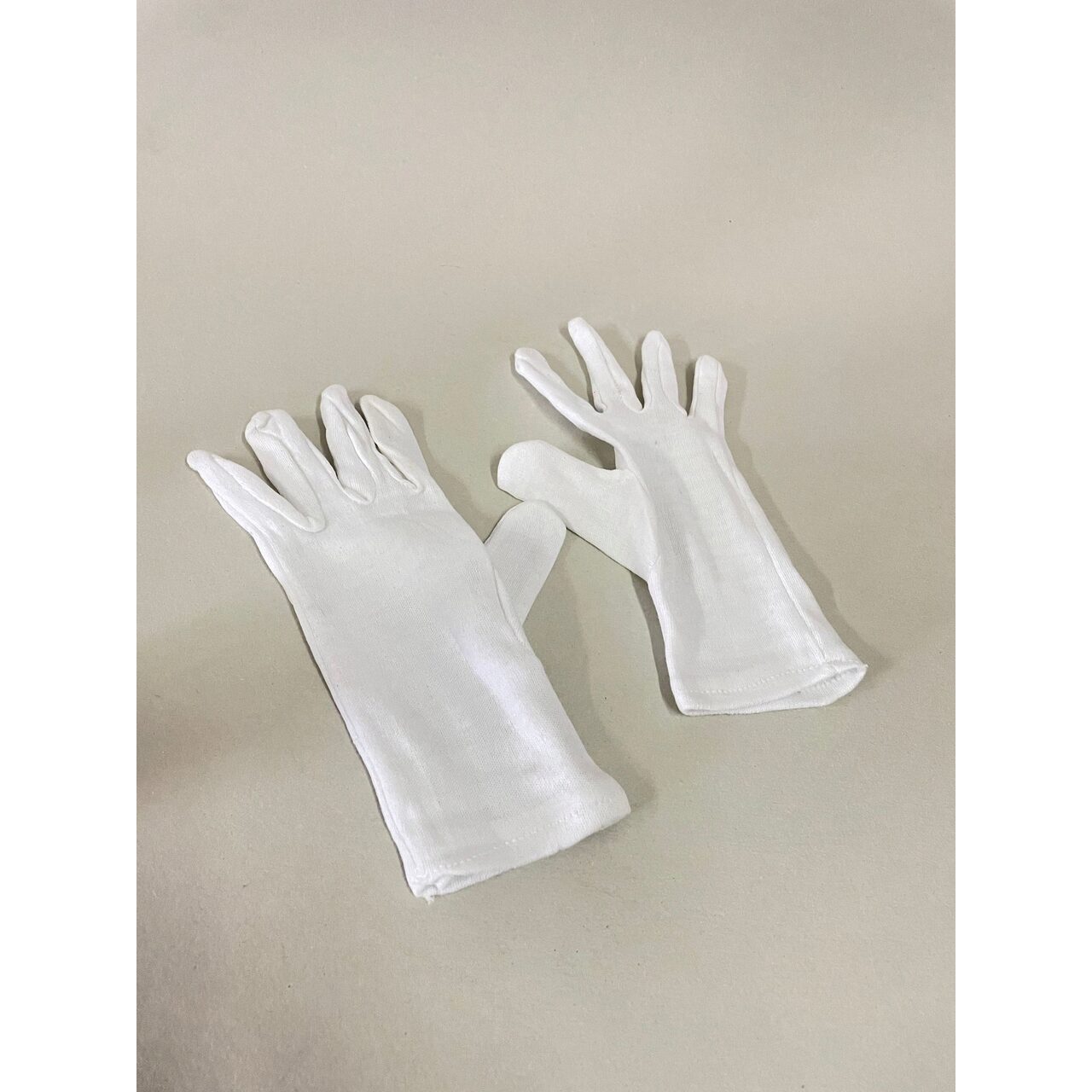 Manusi cusute - tricot interlock fin,din bumbac albit, croiala fourchette, fara manseta.