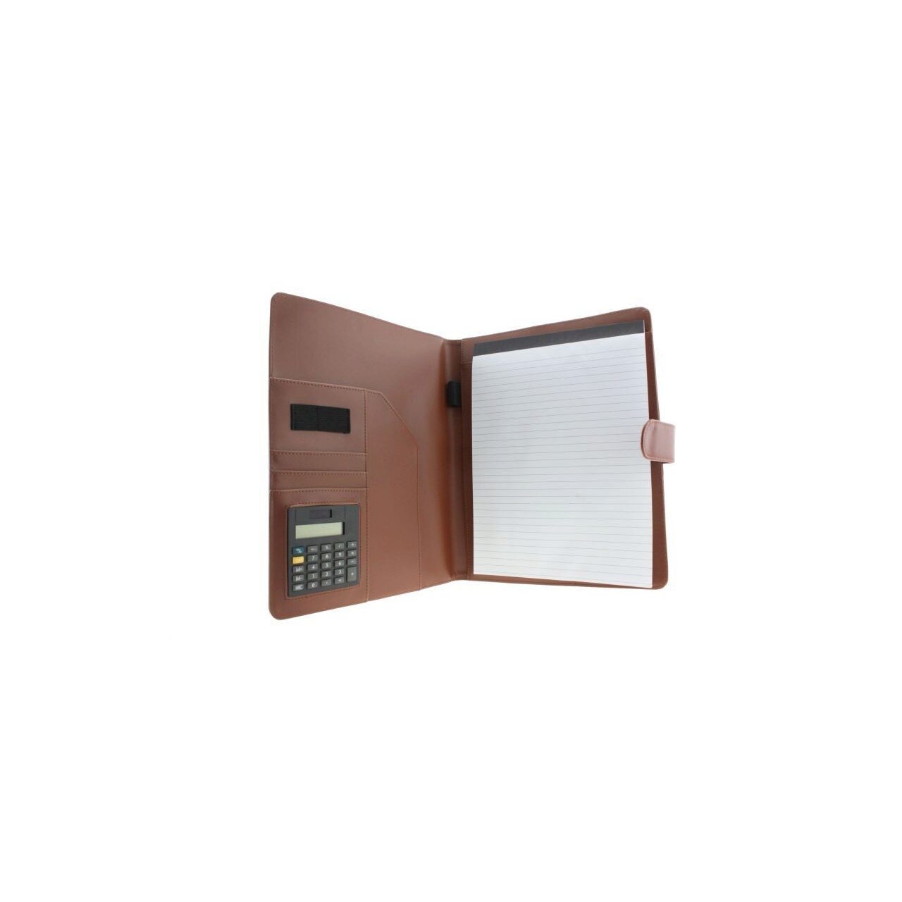 Mapa imitatie piele, cu calculator si bloc notes 20 de pagini incluse. Are buzunar pentru carti de vizita
