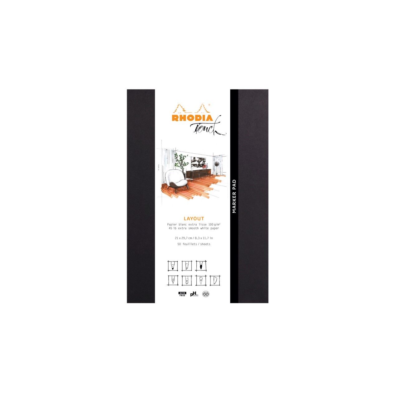 Blocnotes, format portret, Rhodia Touch Layout, 50 file microperforate, detașabile. Instrument de lucru pentru tehnici grafice variate: caligrafie, desen cu markere pe baza de acril și alcool, lucrări în tuș, creion, cerneală. Hârtie Layout de 100g/m2, uni, cu grad înalt de alb, ce suportă tehnici de grafică ce presupun o mare rezistența la umezeală și dispersie a lichidului, un mediu ce facilitează uscarea rapidă a markerului/cernelii/tușului. Coperți din carton Maya® de calitate superioară, 270g/m2, negru. Logo Rhodia Touch embosat pe coperta față.