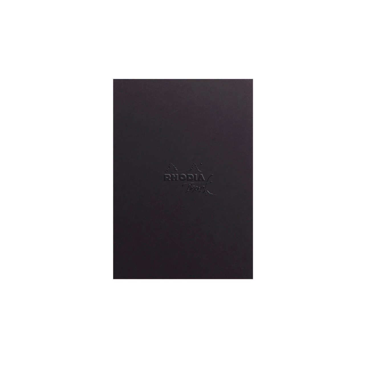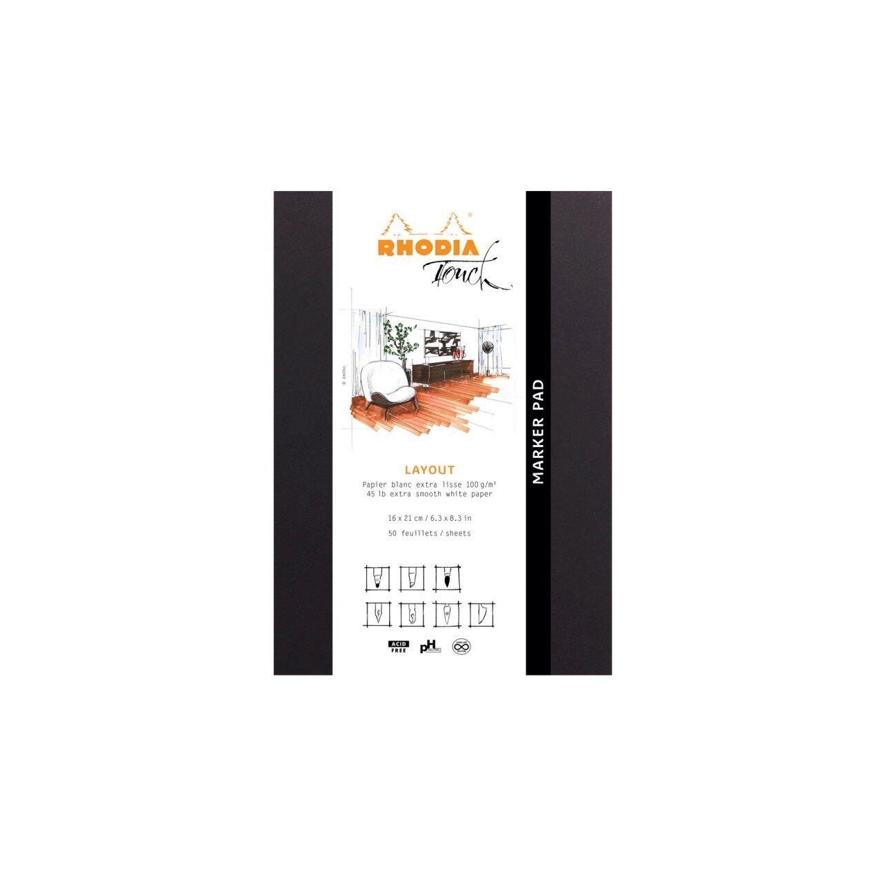 Blocnotes, format portret, Rhodia Touch Layout, 50 file microperforate, detașabile. Instrument de lucru pentru tehnici grafice variate: caligrafie, desen cu markere pe baza de acril și alcool, lucrări în tuș, creion, cerneală. Hârtie Layout de 100g/m2, uni, cu grad înalt de alb, ce suportă tehnici de grafică ce presupun o mare rezistența la umezeală și dispersie a lichidului, un mediu ce facilitează uscarea rapidă a markerului/cernelii/tușului. Coperți din carton Maya® de calitate superioară, 270g/m2, negru. Logo Rhodia Touch embosat pe coperta față.