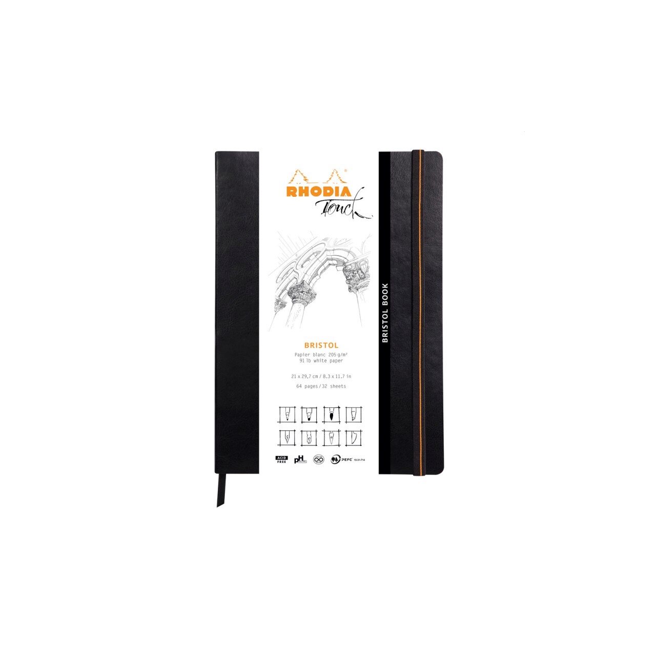 Instrument de lucru pentru tehnici grafice ce necesită acuratețe și precizie, în lucrări ce implică utilizarea creionului, instrumentelor cu vârf din fetru, linere de precizie, peniță. Hârtie Bristol albă, extra netedă 205g/m2, uni, cu înalt grad de alb, ce suporta tehnici de grafica ce presupun straturi multiple de cerneală, corecții repetate, fără decopertarea suprafeței. Coperți din carton îmbrăcat în piele ecologică extrafină, negru. Logo Rhodia Touch embosat pe coperta față. Închidere cu elastic bicolor. Hârtia este înălbită fără acid și Ph neutră.