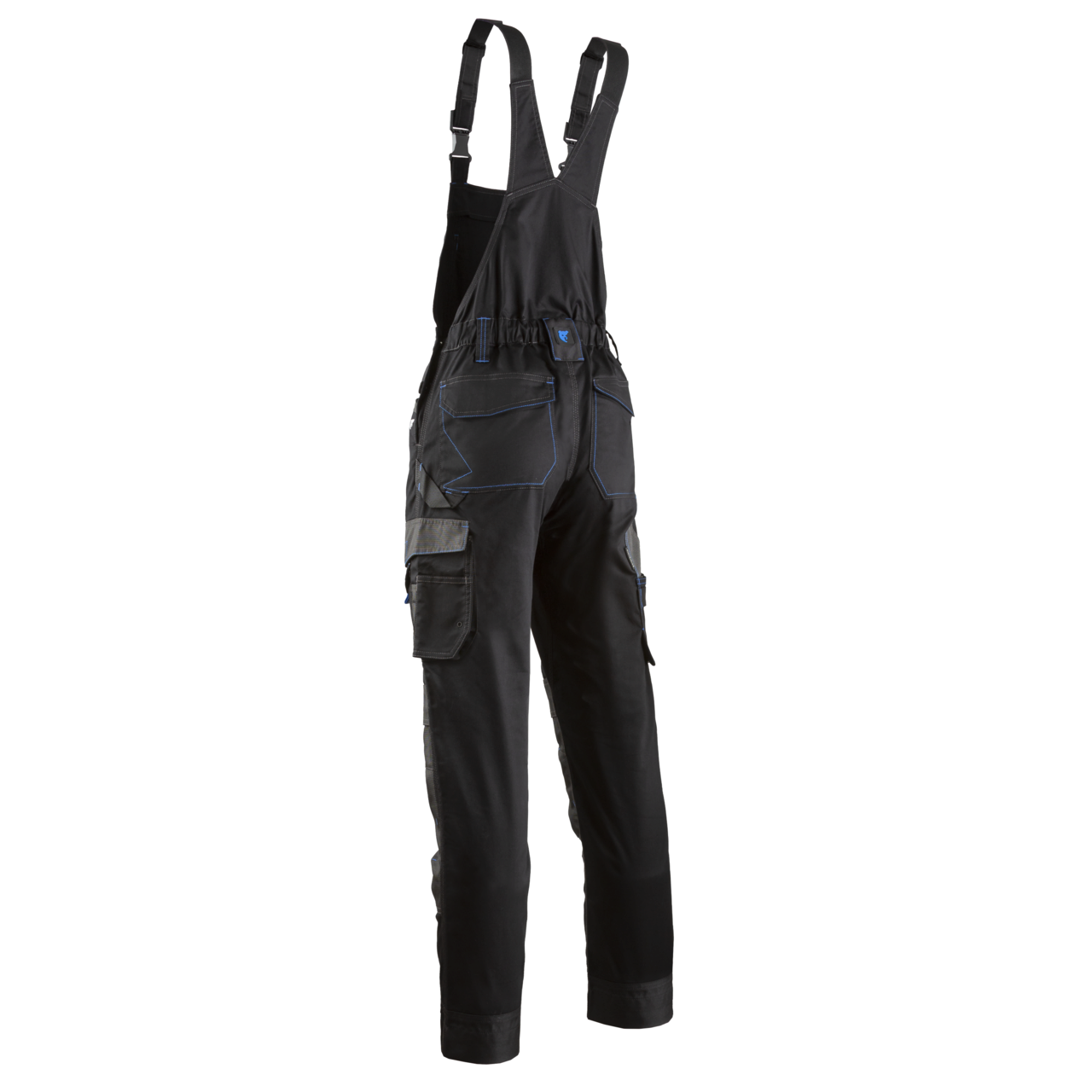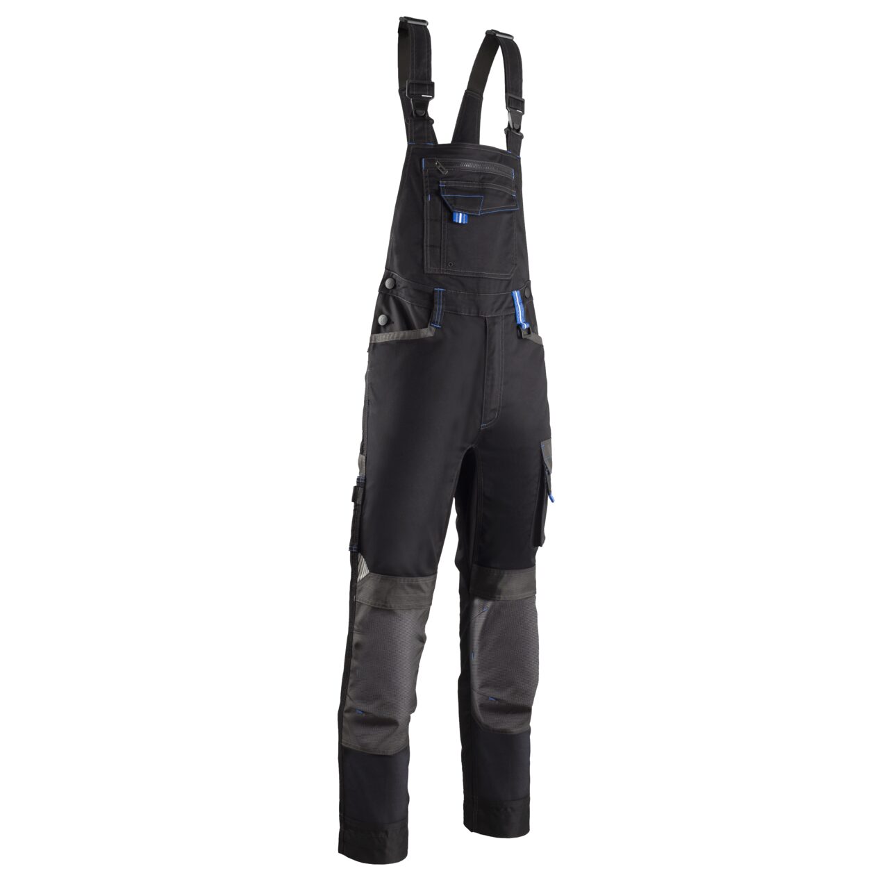 TWILL: 65% poliester/ 32% bumbac / 3% elastan - 250g/m2 + poliamidă / inserții elastice + Fancy Oxford 300D Spate înalt 9 buzunare 2 bucle pentru scule Bretele elastice Talie elastică Panou elastic intre picioare Buzunare pentru genunchiere Finisaje de culoare contrastantă Cusături triple Tiv suplimentar: +5cm Croială regular EN 14404: Tip 2