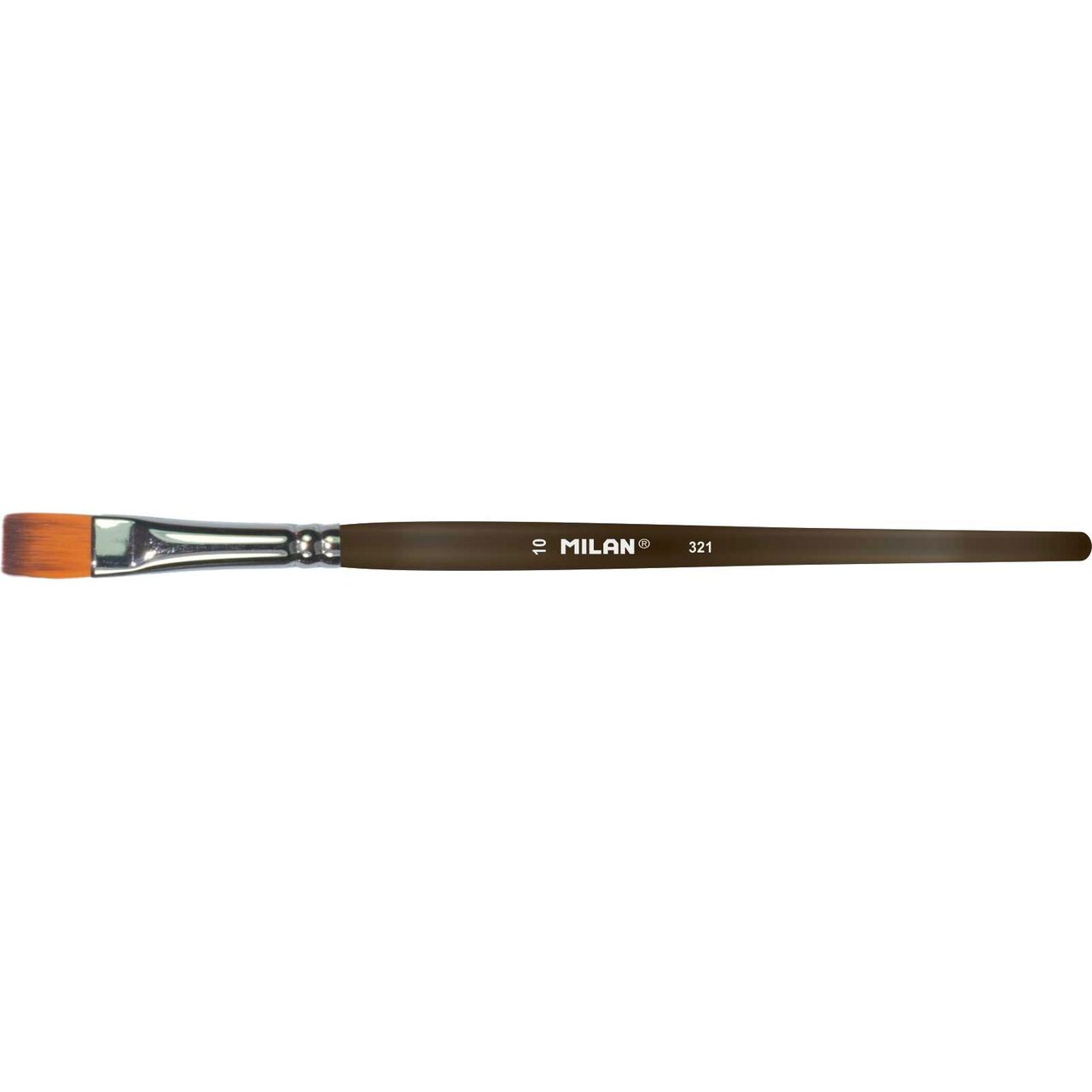 Pensula profesionala Milan, din par sintetic, forma lata, cu varf drept, virola din alama nichelata si coada scurta. Pensula rezistenta, potrivita pentru majoritatea tehnicilor de pictura, de la acuarele, tempera, guase, pana la acrilice sau culori de ulei. Ideala pentru trasarea liniilor groase sau umplerea suprafetelor. Diametru fir: 0,1 mm. Marime pensula: 10