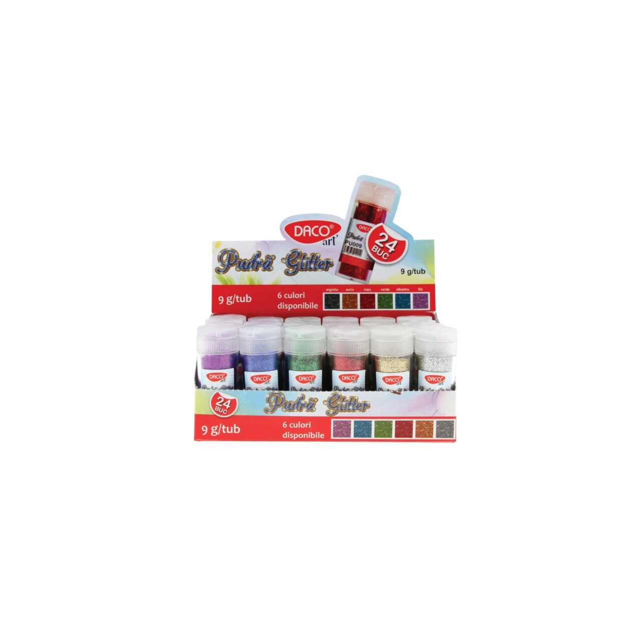 Pudra cu sclipici, 24 buc/cutie, 6 culori disponibile (argintiu, auriu, rosu, verde, albastru, lila)