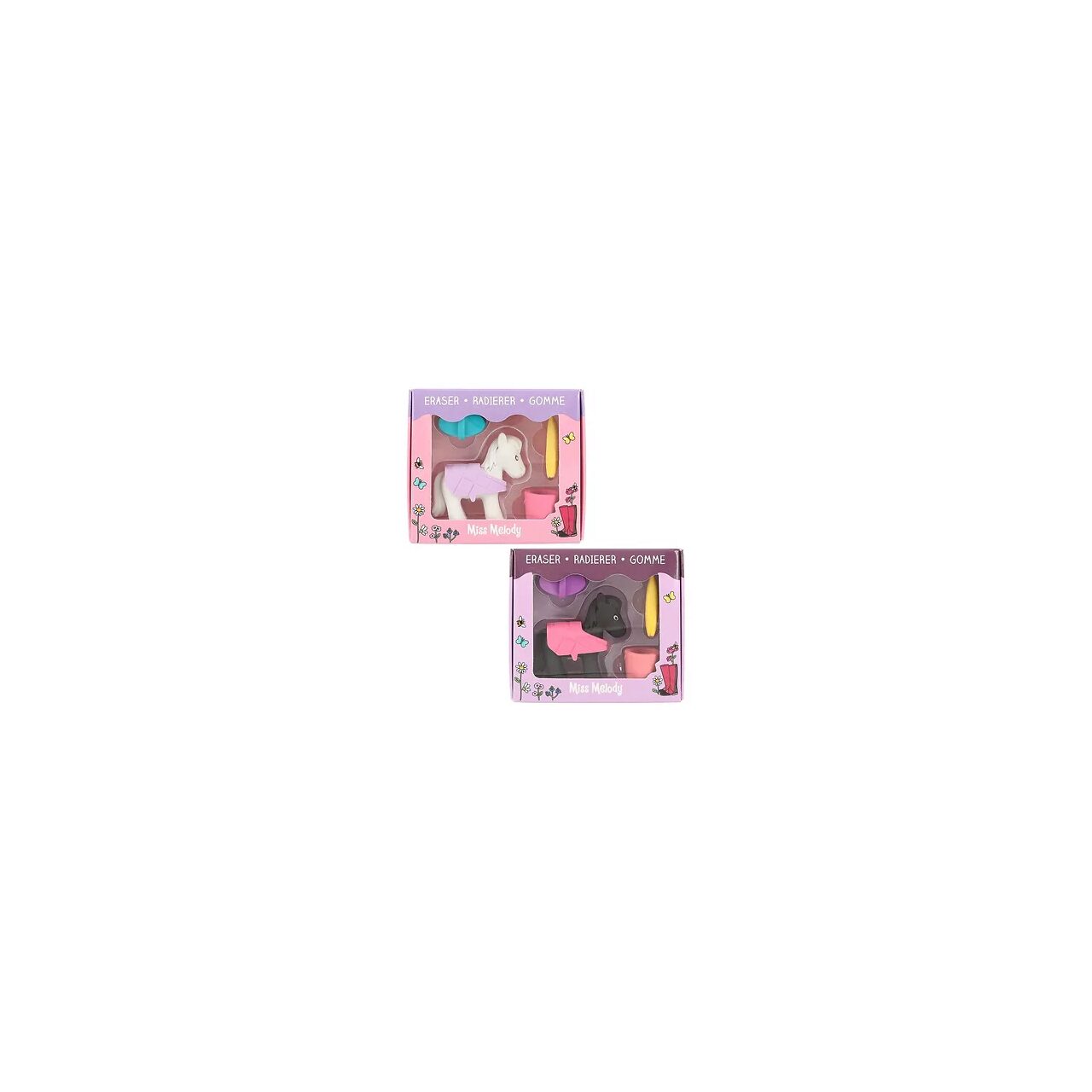 Cea mai draguta radiera pentru fanii cailor de la Miss Melody: Setul contine un cal 3D (negru sau alb) cu sa, o galeata cu apa si o banana. Pentru asamblare, demontare, joc si, bineinteles, stergere.