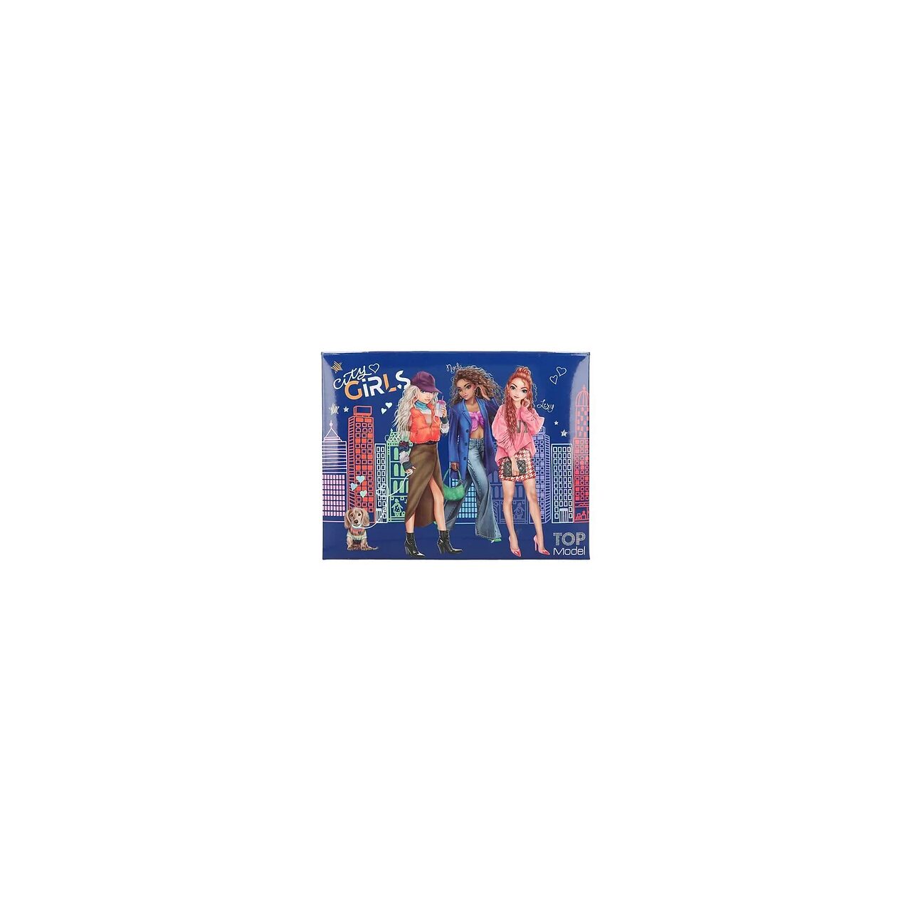 Totul pentru birou: Setul cu cutie de la TOPModel include 3 creioane colorate cu model, 1 radiera cu imprimeu dragut cu catel teckel, precum si 25 de agrafe albastre si 100 de biletele. Cutia in albastru inchis este imprimata cu un model mare în culori strălucitoare in fata unui orizont ilustrat colorat. In interiorul capacului are o oglinda