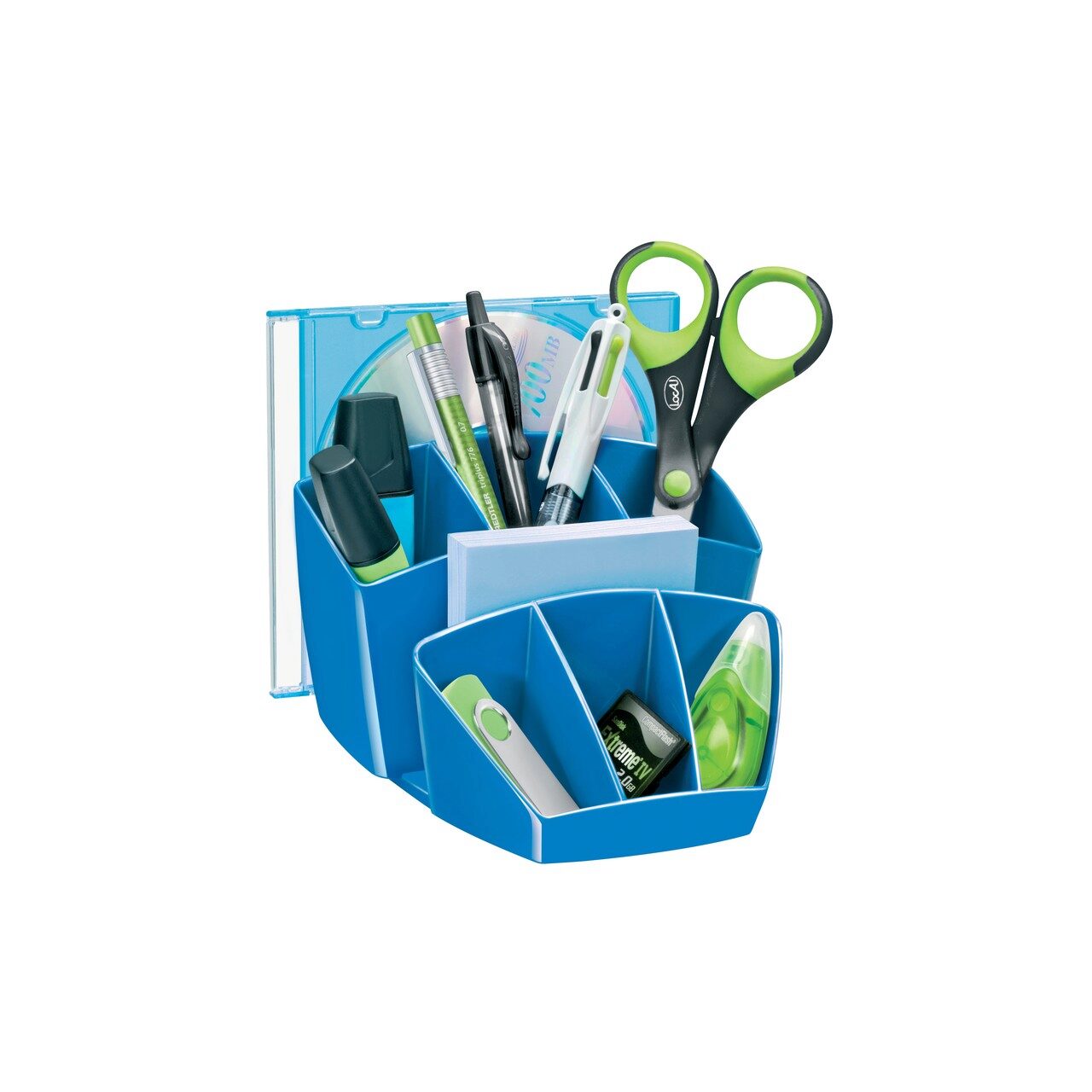 - 8 compartimente în care pot fi păstrate pixuri, textmarkere, foarfece, CD, notesuri adezive sau alte articole mici de birou