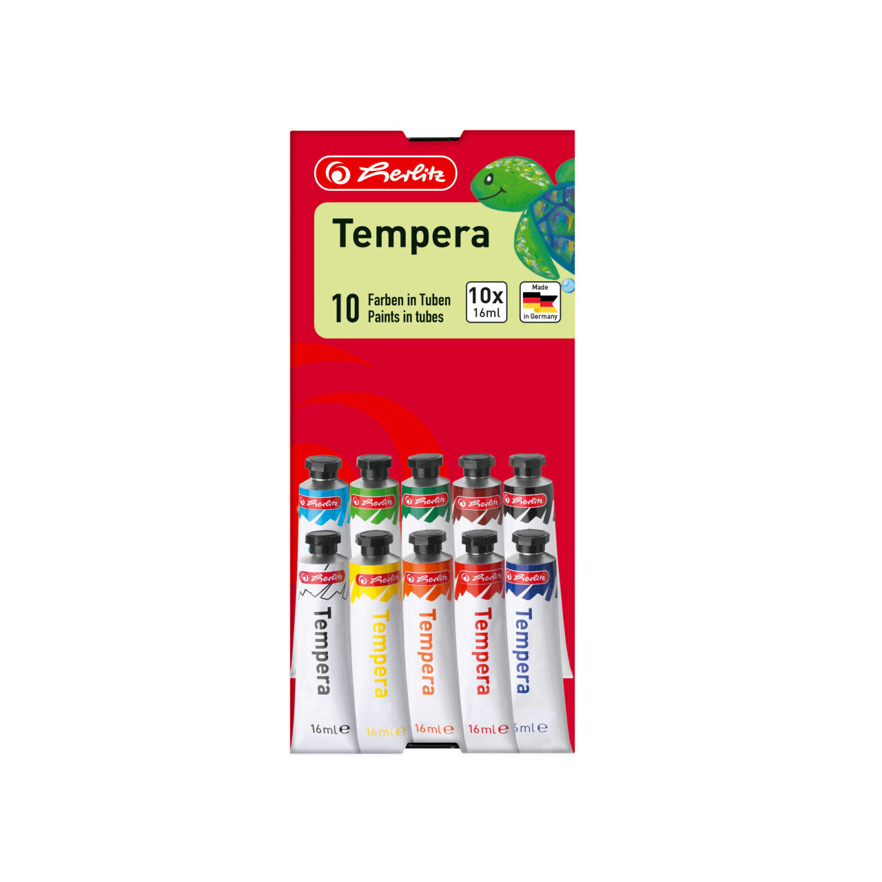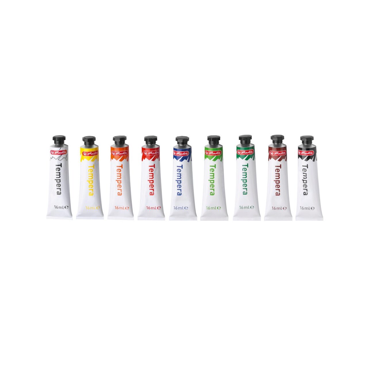 Acuarele tempera, set 10 culori intense, solubile in apa, grad de acoperire bun, mixabile, tub 16 ml/culoare, prezentare: cutie de plastic.